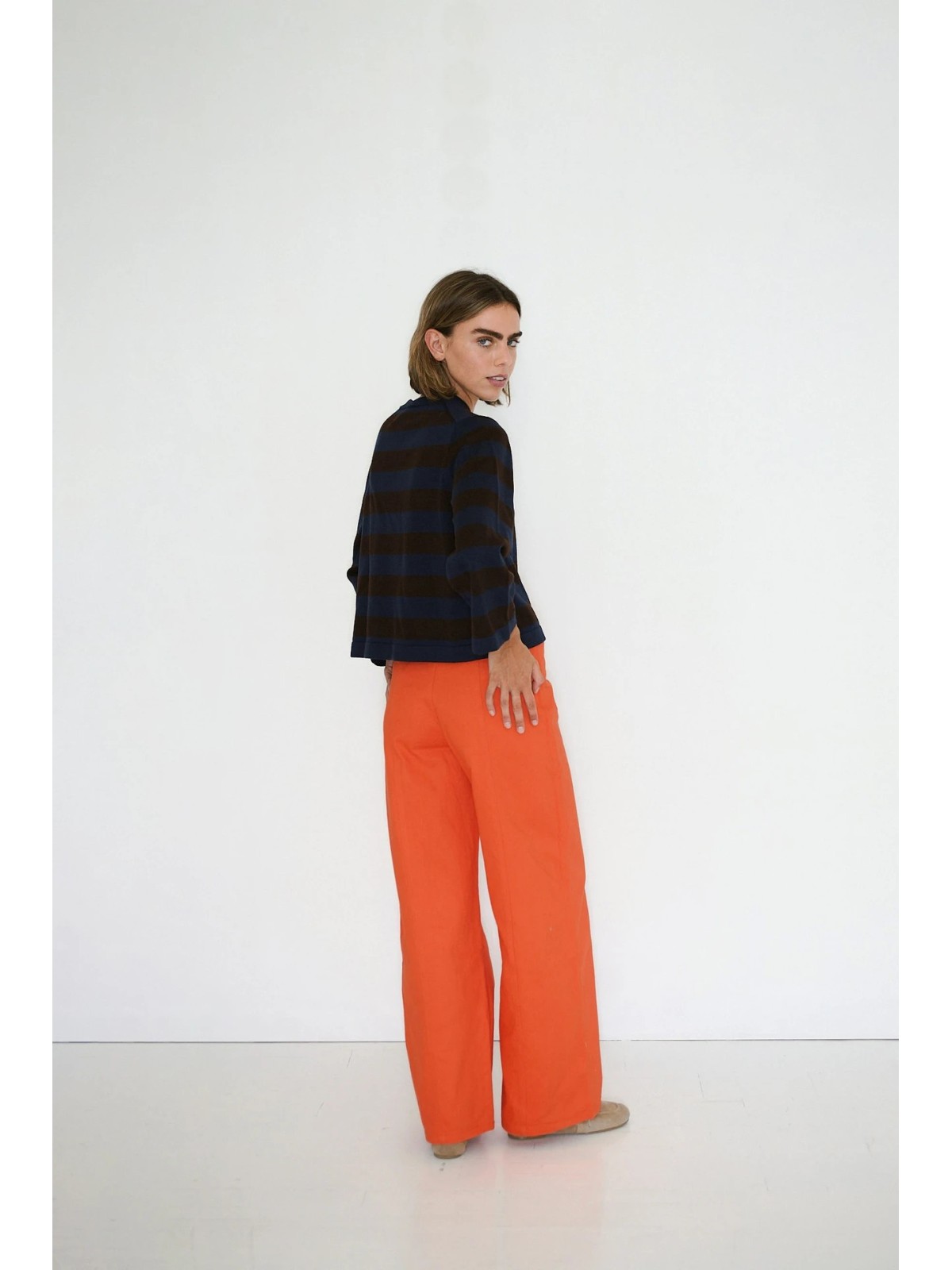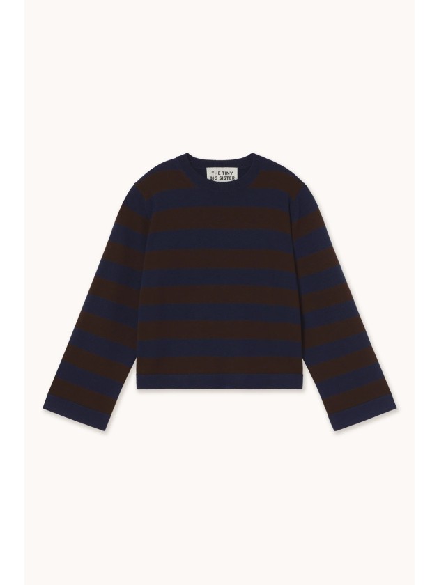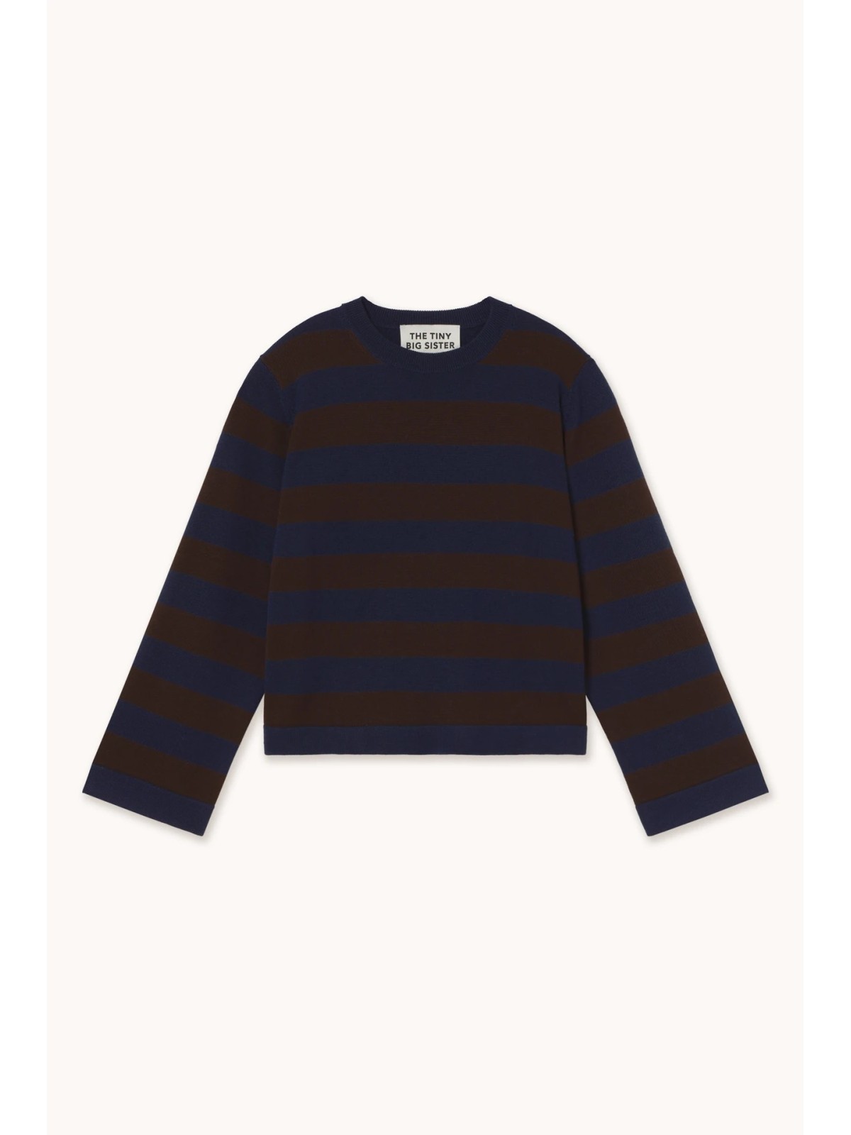 Jersey Chloe confeccionado en lana merino extrafina con rayas en azul marino y marrón chocolate. Corte relajado con mangas voluminosas y tejido acabado con técnica fully fashioned