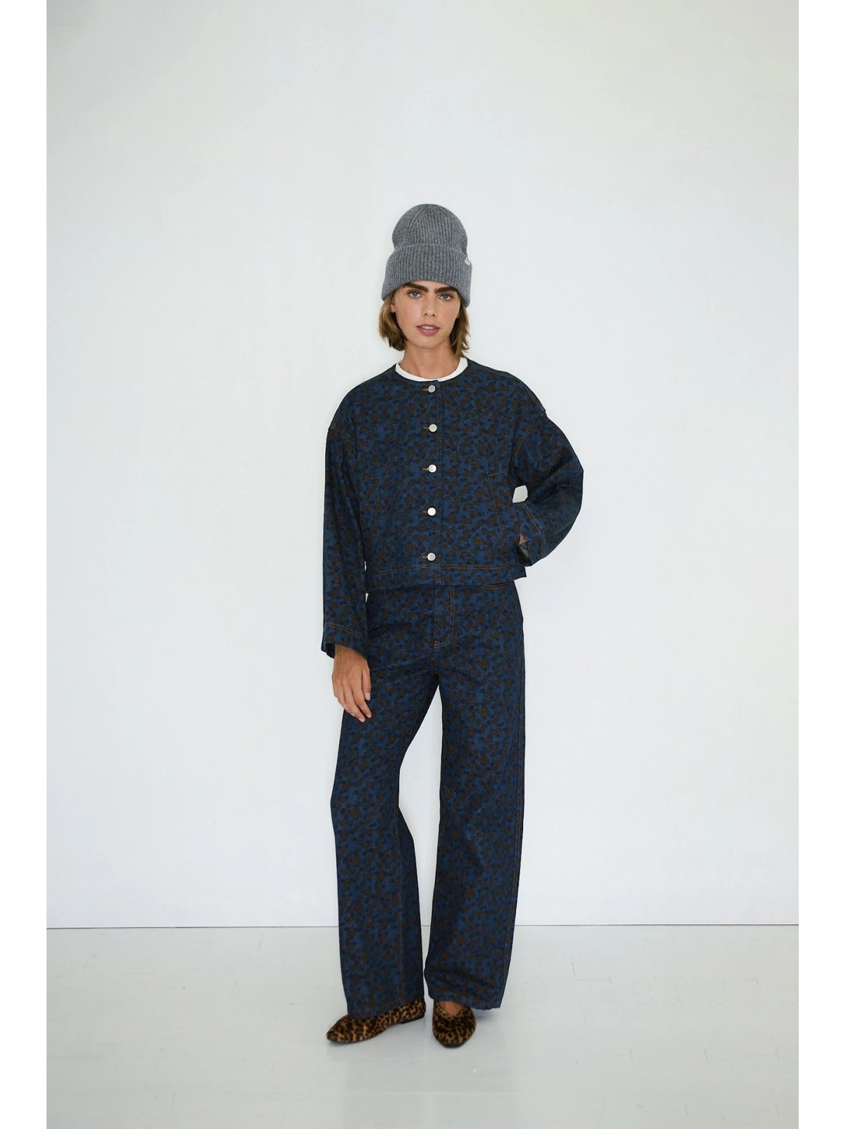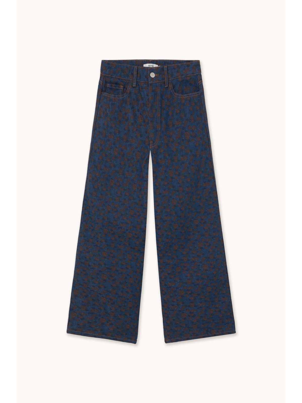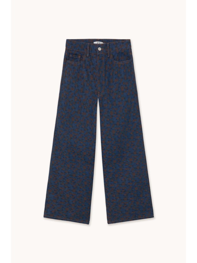 Nuestra silueta clásica Berta en denim de lavado medio con estampado floral. De talle alto y pernera ancha y alargada, incorpora cierre con cremallera y el clásico diseño de cinco bolsillos