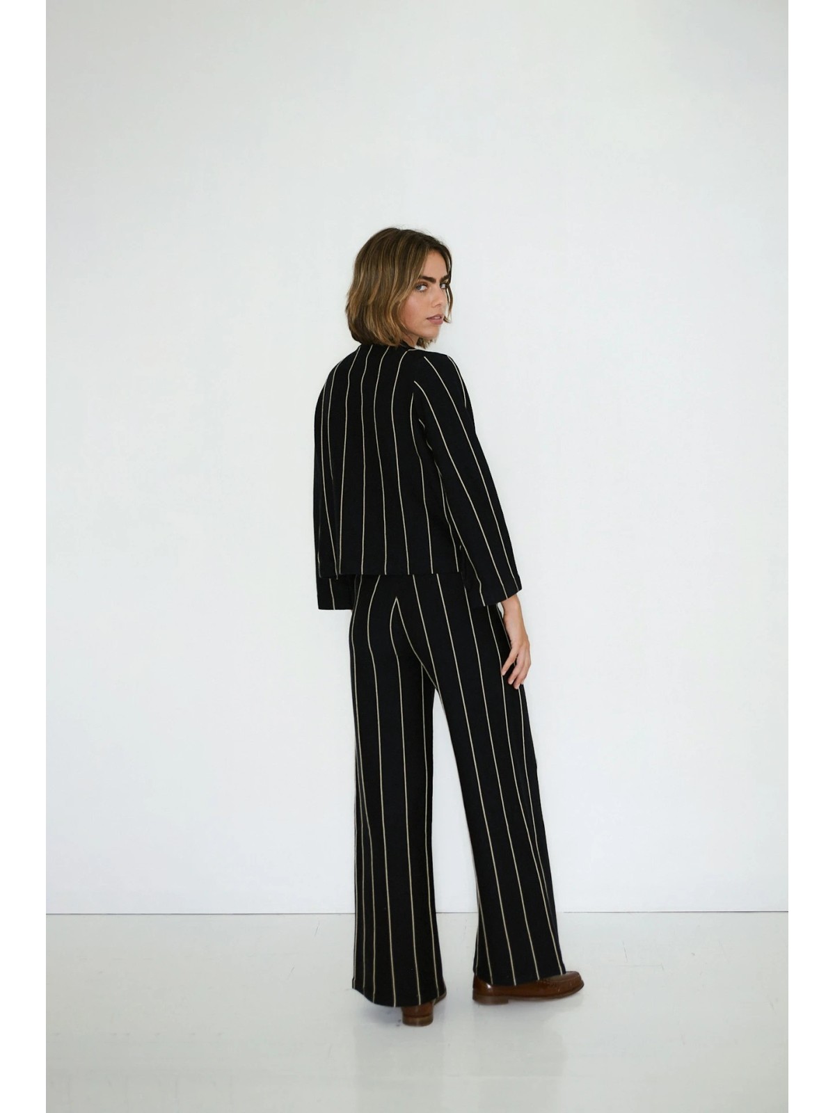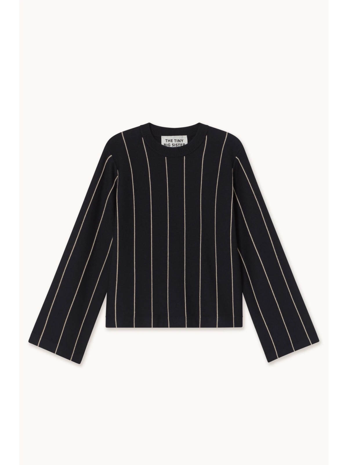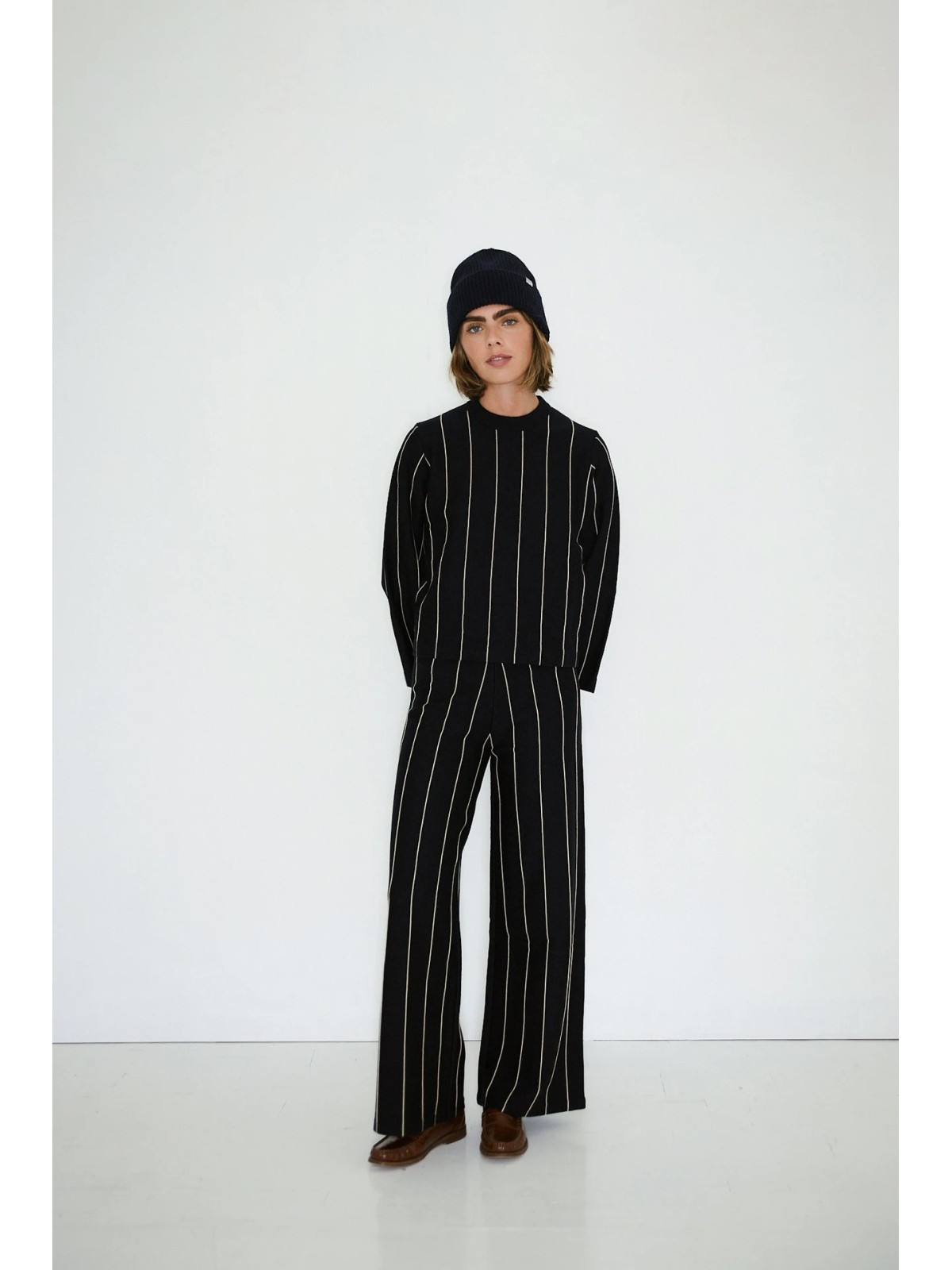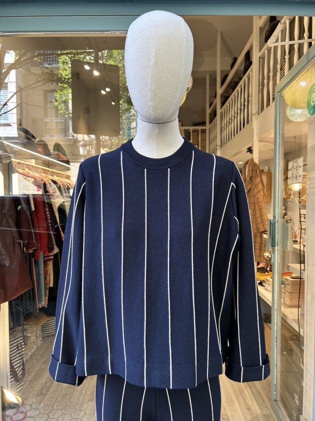 Jersey en punto con estructura de mezcla de lana y algodón, en azul marino, con franjas verticales texturizadas a contrastante. Diseñado con corte relajado y mangas voluminosas, es una prenda esencial y atemporal para el día a día. Combínalo con el pantalón a juego para un conjunto coordinado.