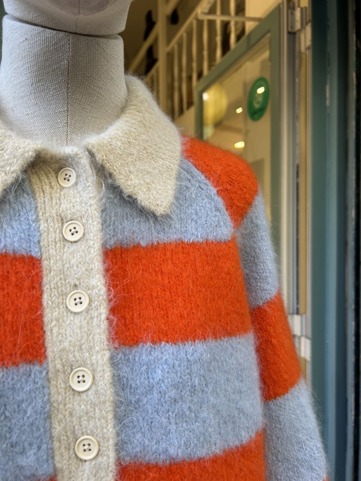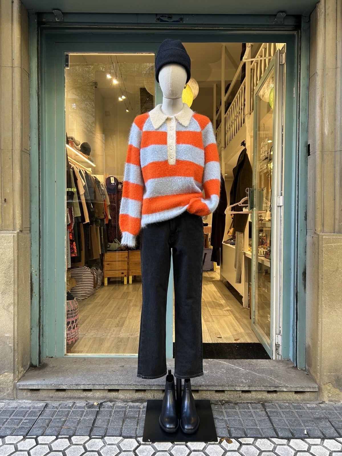 Polo de punto con un diseño renovado de silueta clásica. Tejido con rayas oversize en rojo anaranjado y azul claro. Cuello y tapeta en contraste que aportan un aire pulido y preppy. Acabados acanalados y detalles fully fashioned que aportan estructura y definición al ajuste