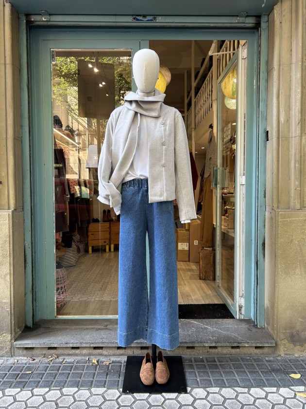 Chaqueta corta con solapa/bufanda y botonadura ladeada. Es una chaqueta de entretiempo no especialmente gorda y sin bolsillos.