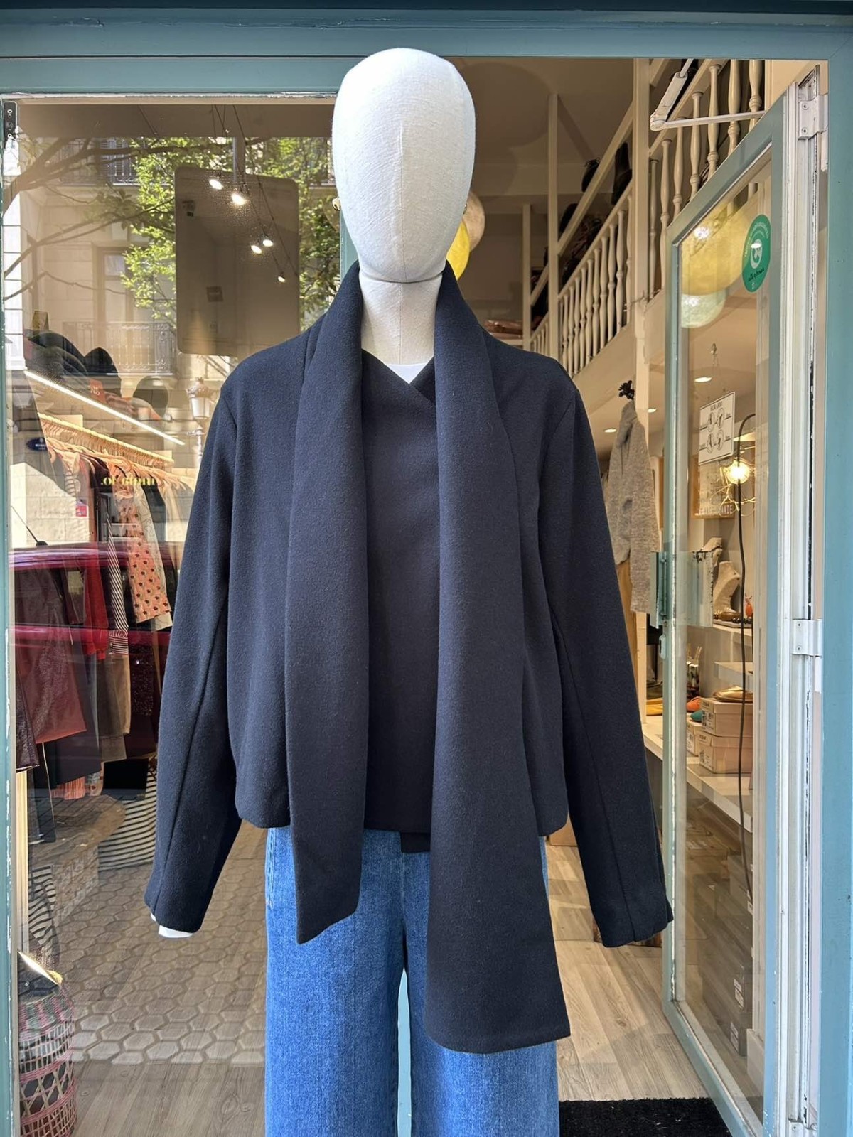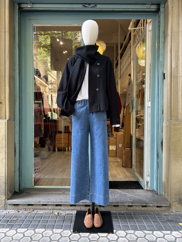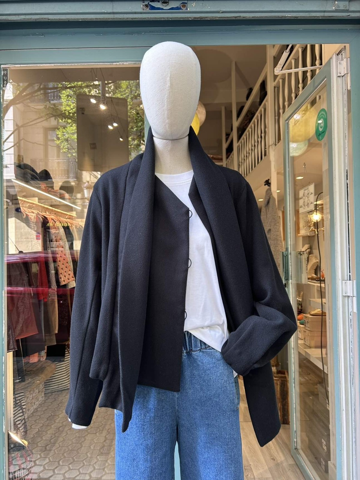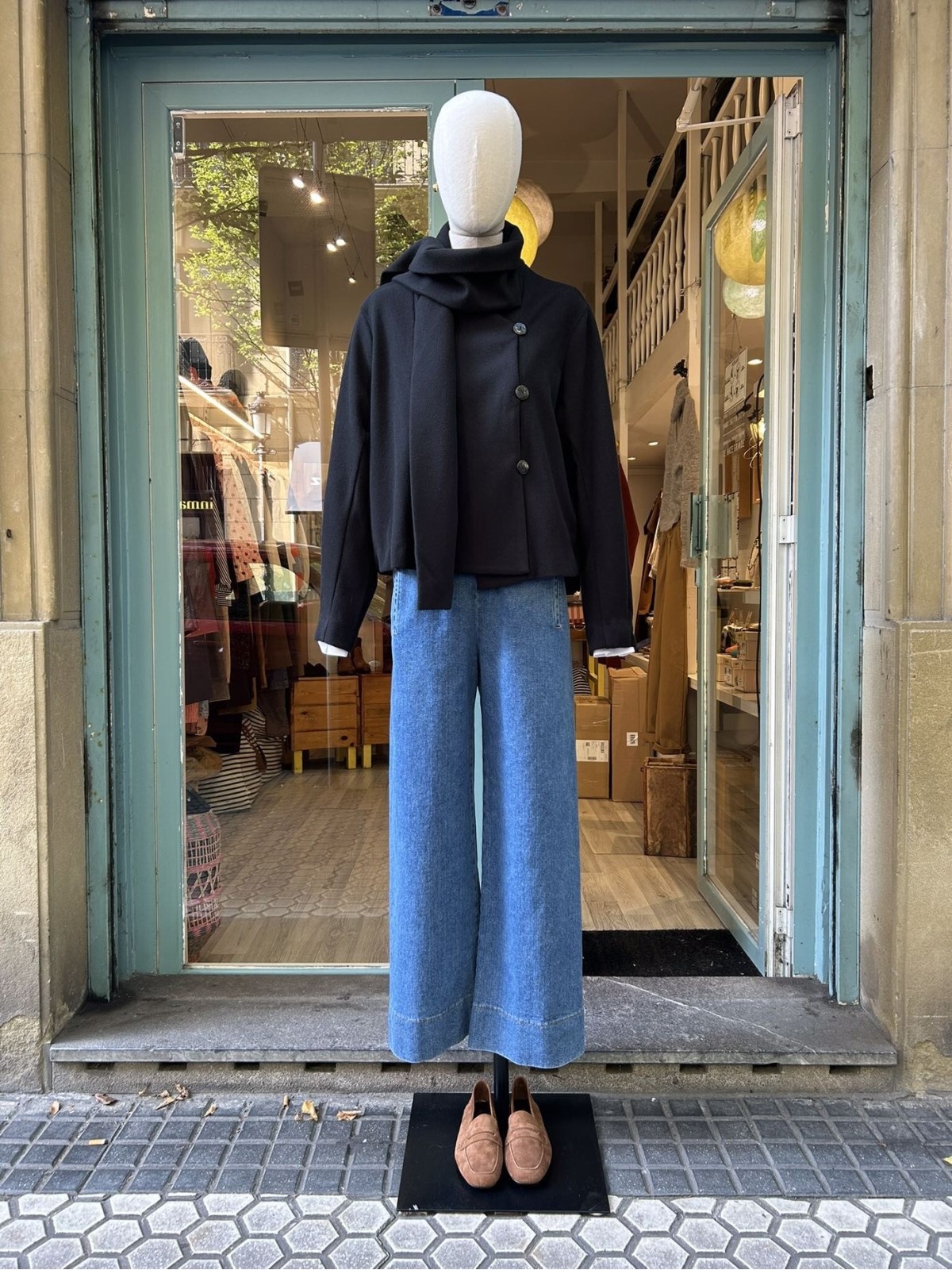 Chaqueta corta con solapa/bufanda y botonadura ladeada. Es una chaqueta de entretiempo no especialmente gorda y sin bolsillos.