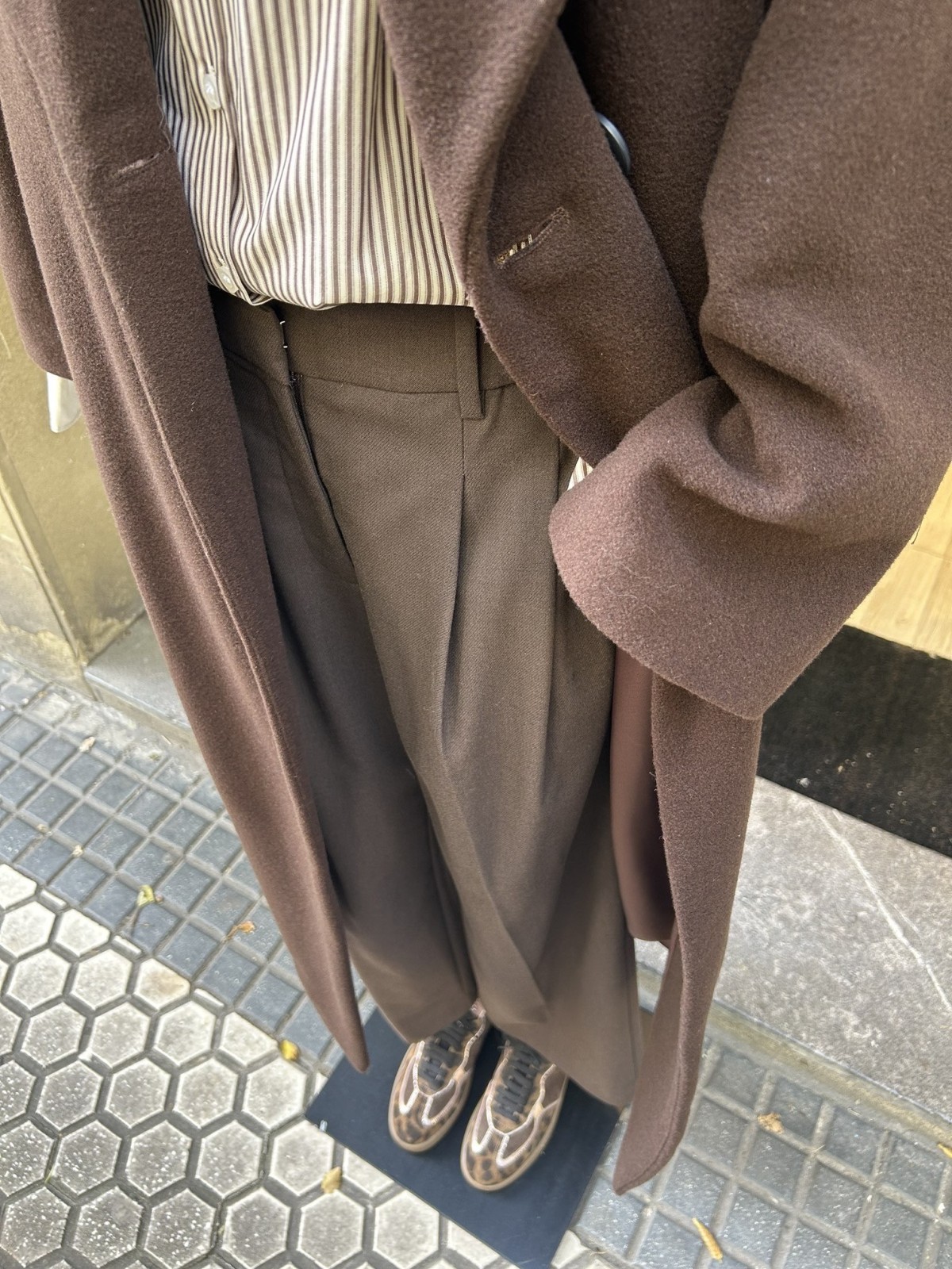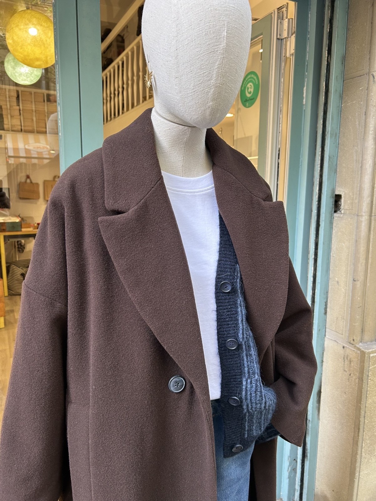 Abrigo oversize de paño de lana de doble cara. Estilo sastre con cuello de solapa y cierre cruzado con dos botones. Bolsillos laterales. Forrado.