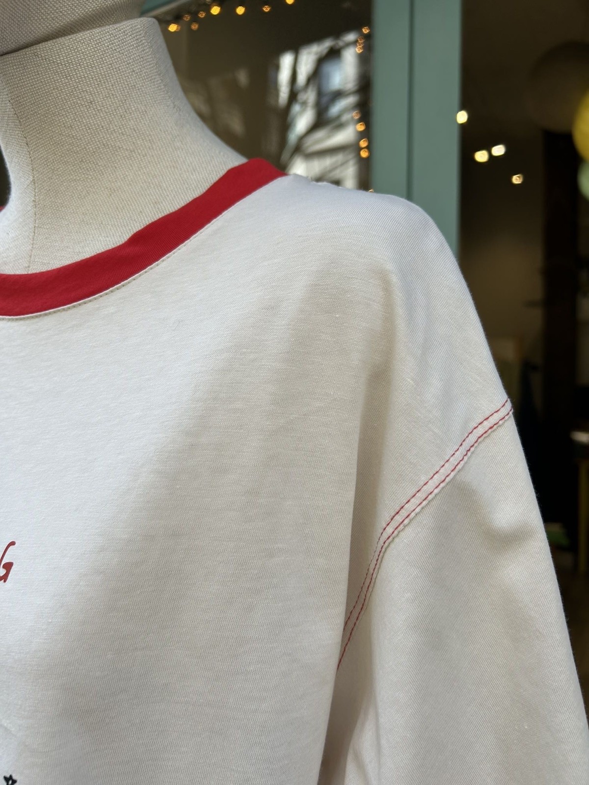Camiseta serigrafiada con costuras en rojo a juego con el cuello