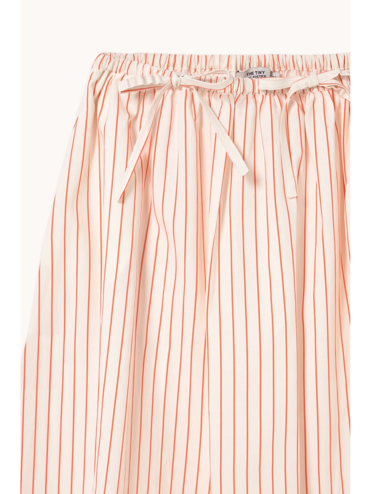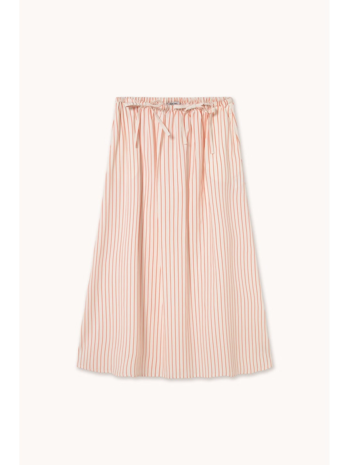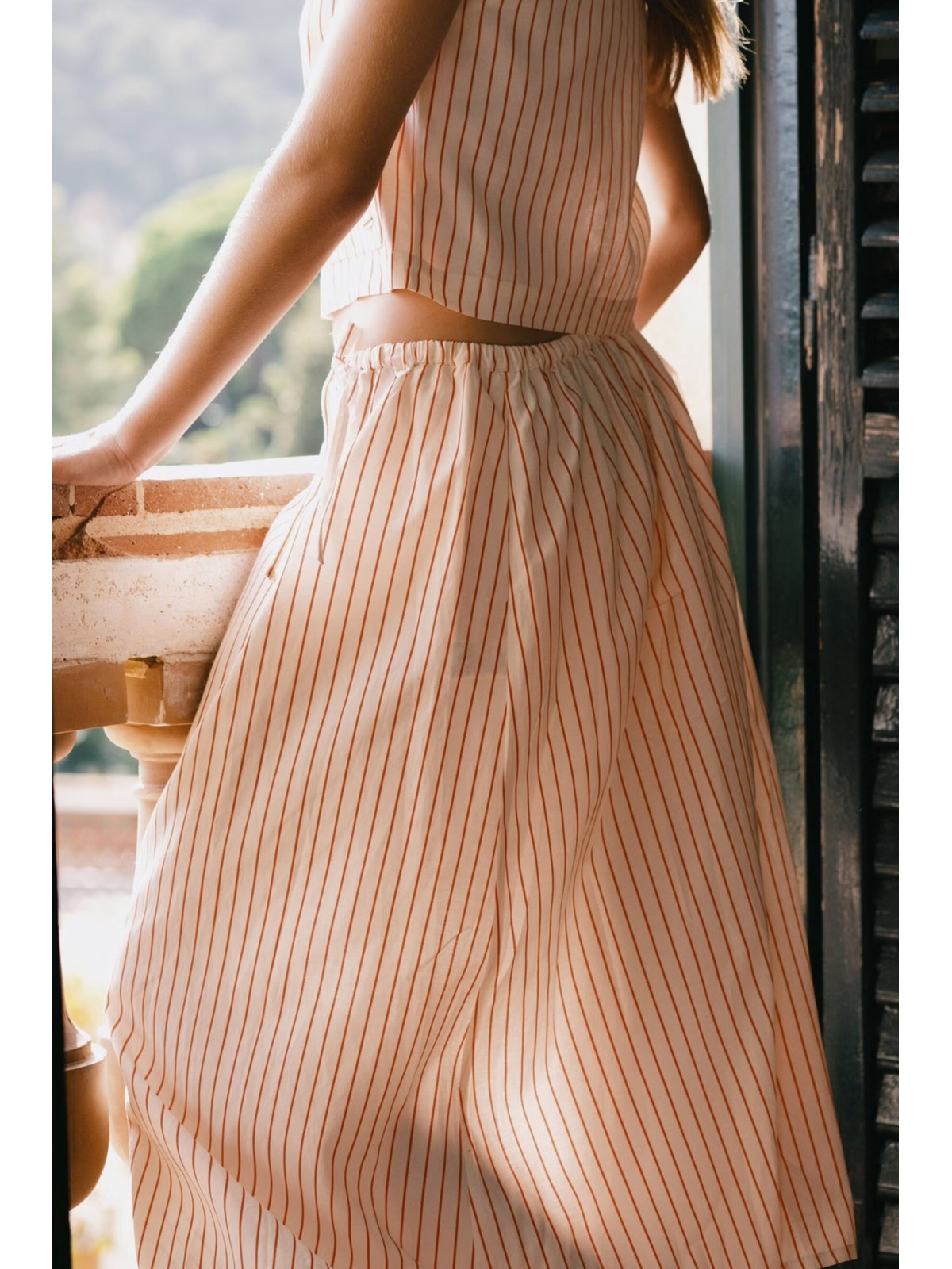 Falda larga confeccionada en mezcla de algodón, viscosa y lino, con ligera textura, transpirable y liviana, de caída suave y fluida. De base color blanco roto con estampado de rayas, presenta cintura elástica con detalles de lazo y silueta voluminosa y fluida. Disponible con el top a juego para un look coordinado.