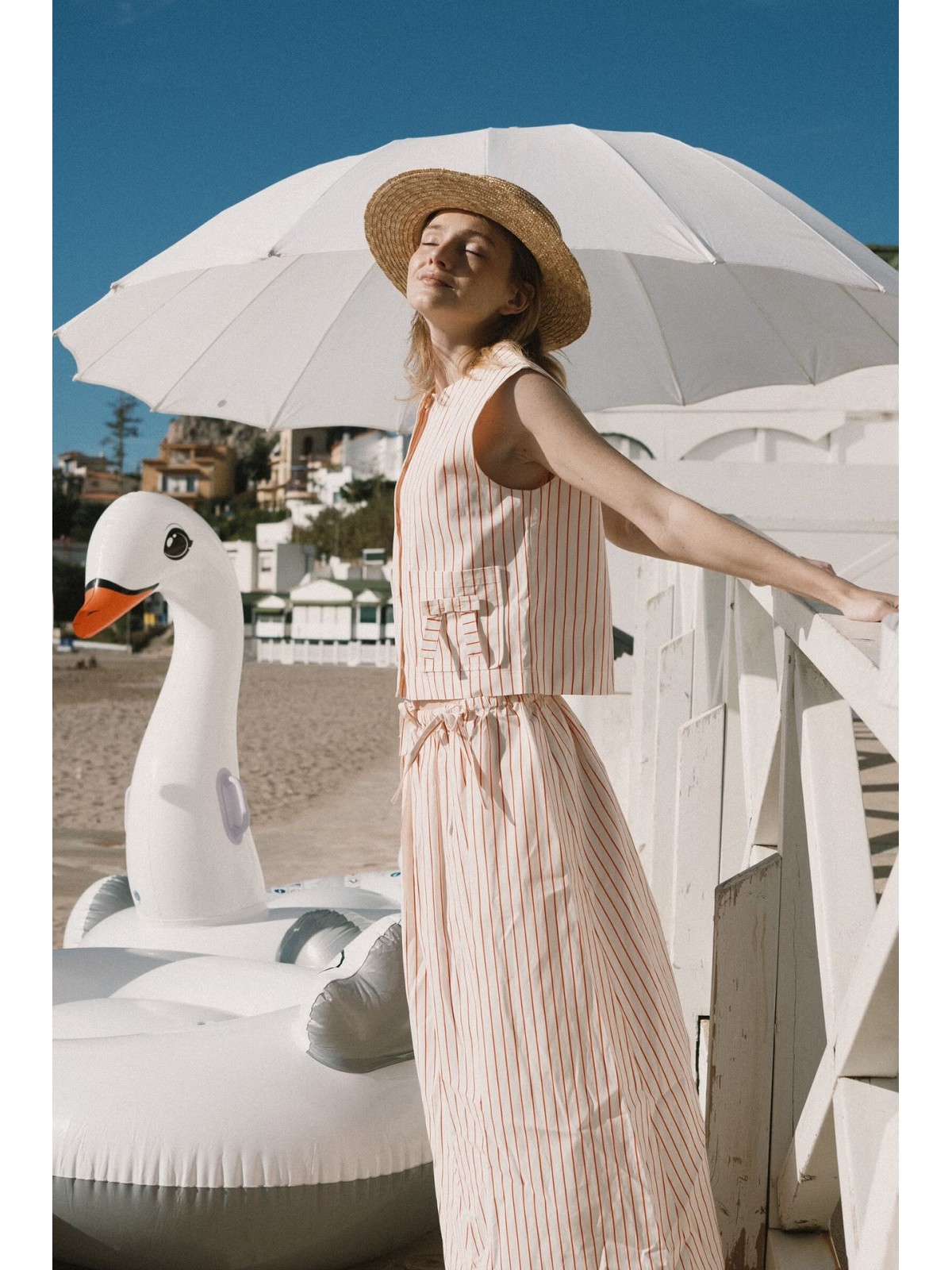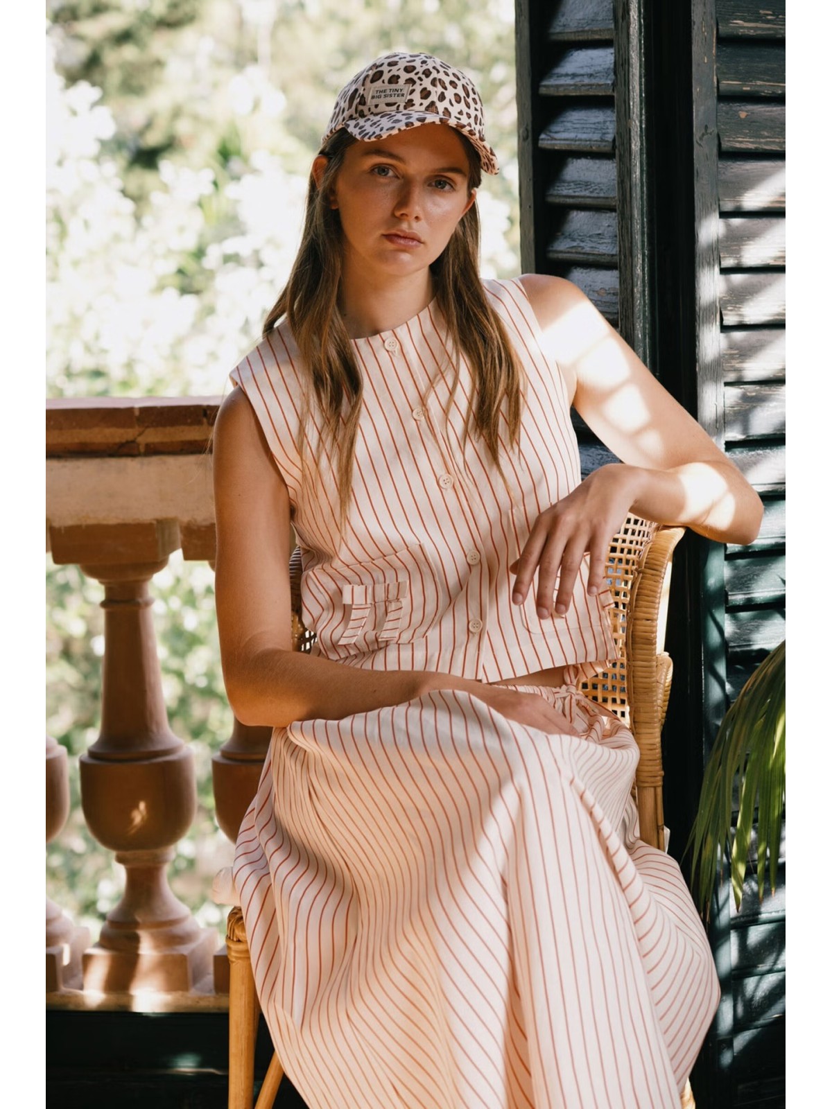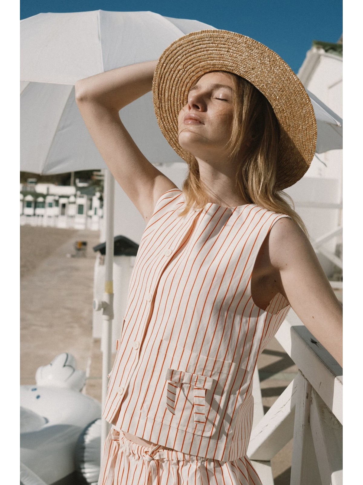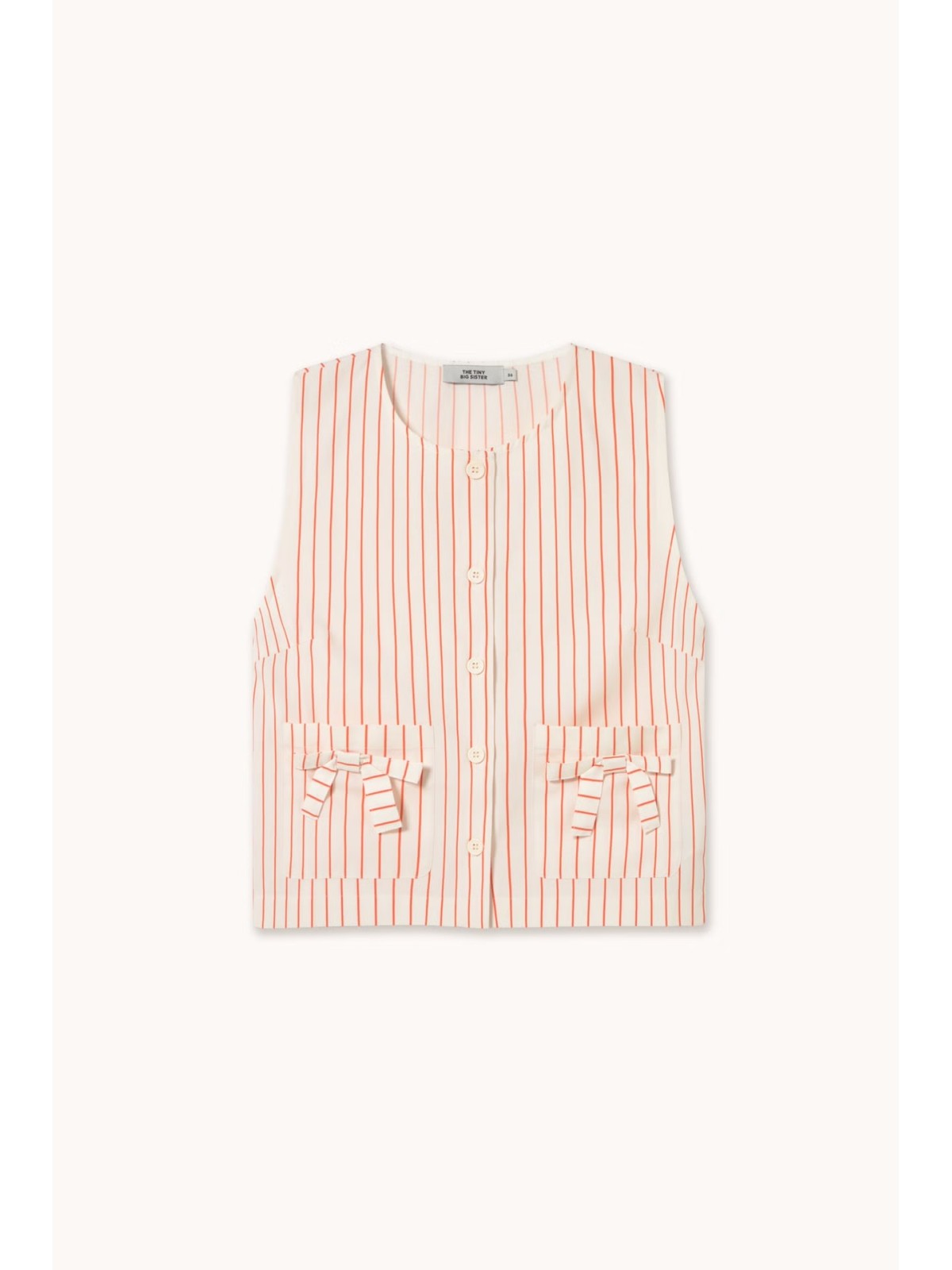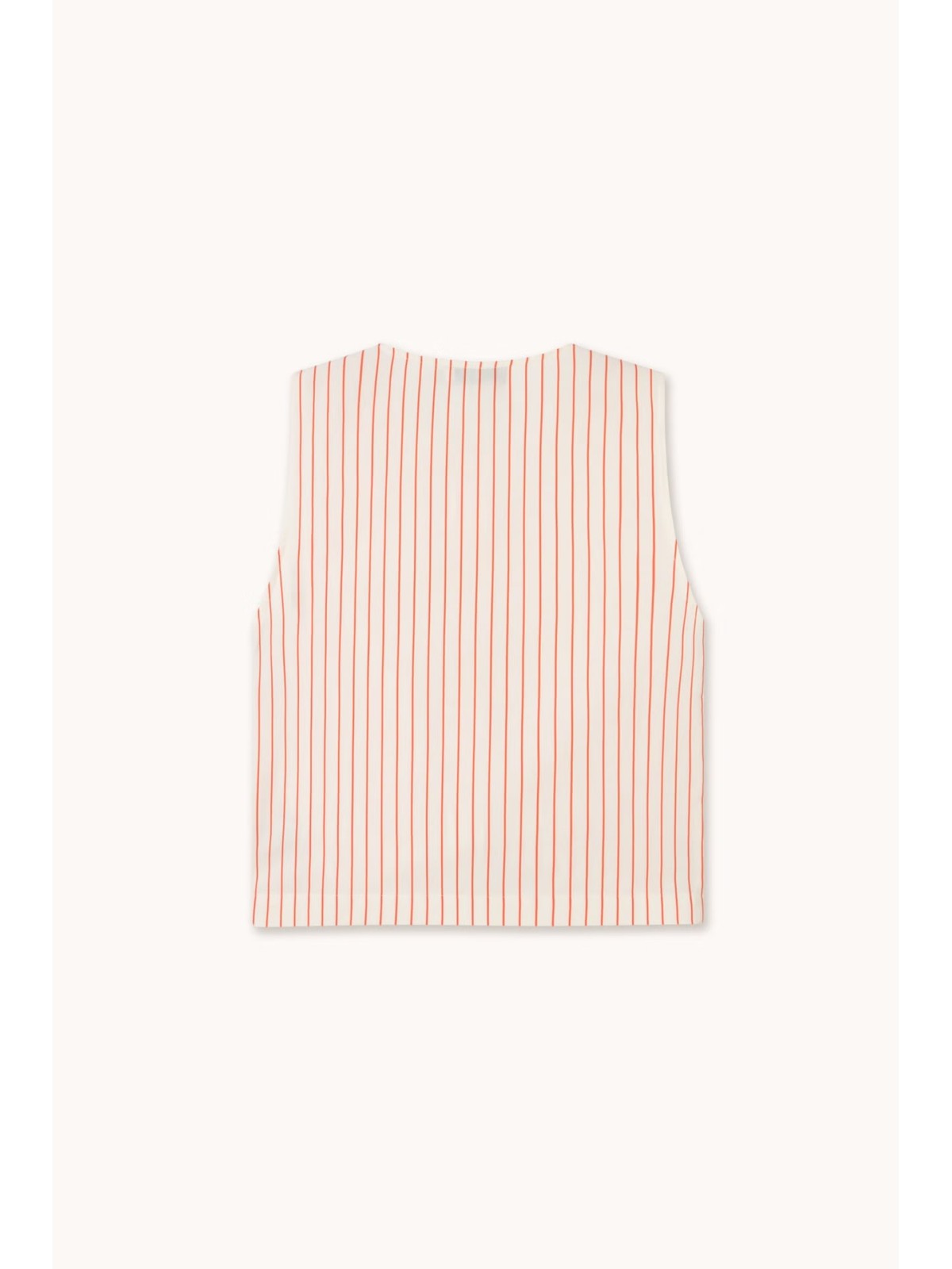 Top sin mangas confeccionado en mezcla de algodón, viscosa y lino, con ligera textura, transpirable y ligero, de caída suave y fluida. De base color blanco roto con estampado de rayas. Presenta una silueta ligeramente cuadrada, bolsillos parche, detalles de lazos y cierre frontal completo con botones.