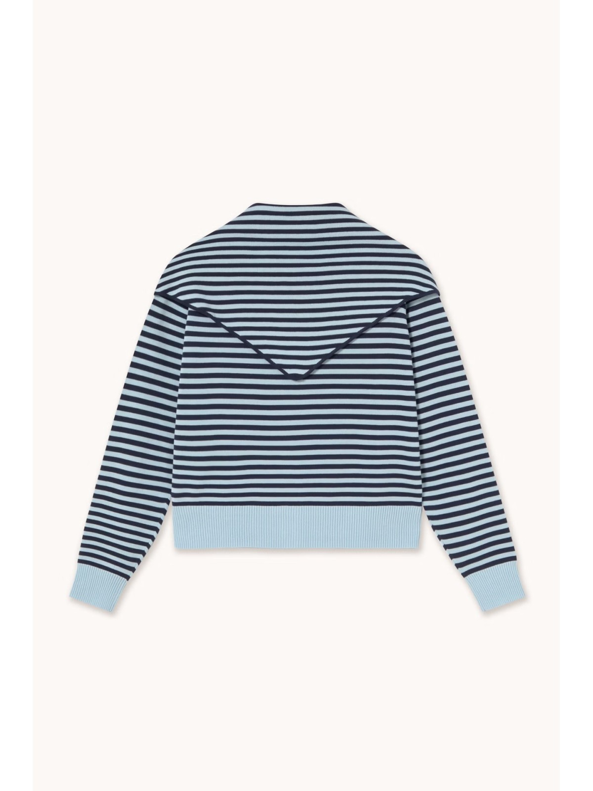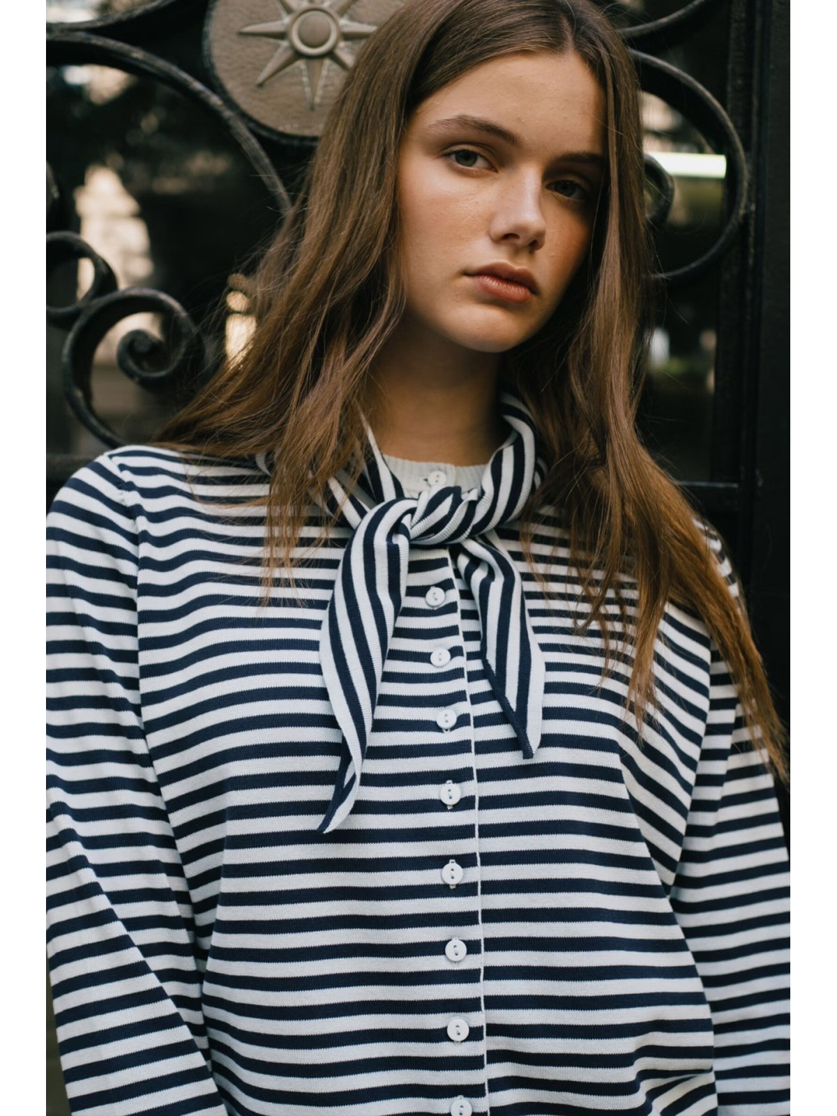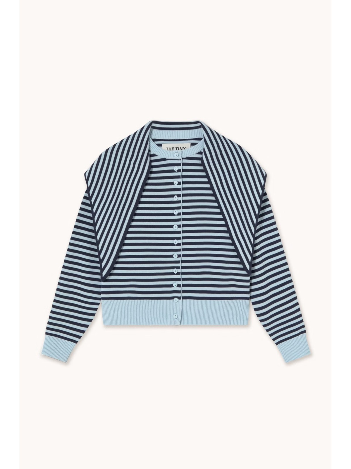 Cárdigan de punto confeccionado en algodón puro de alta torsión con acabado de tacto seco. Base a rayas en azul claro y azul marino, con cuello tipo pañuelo que se puede anudar y cierre frontal con botones.