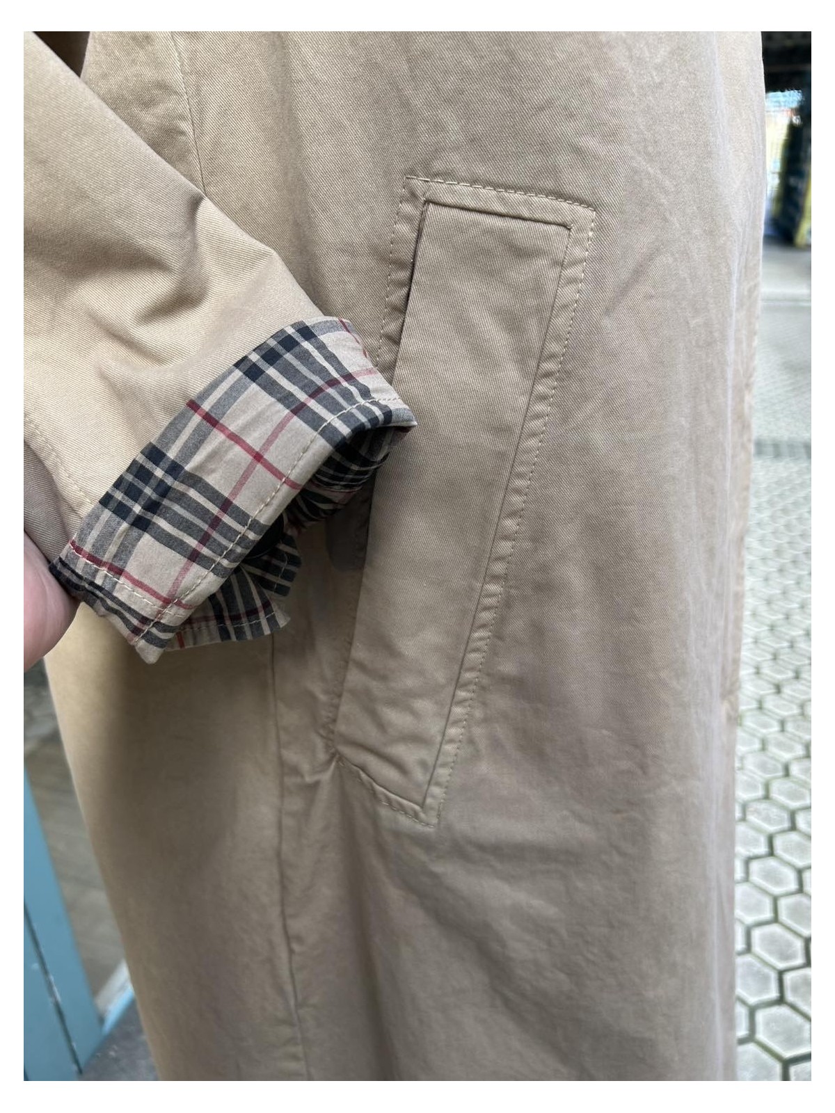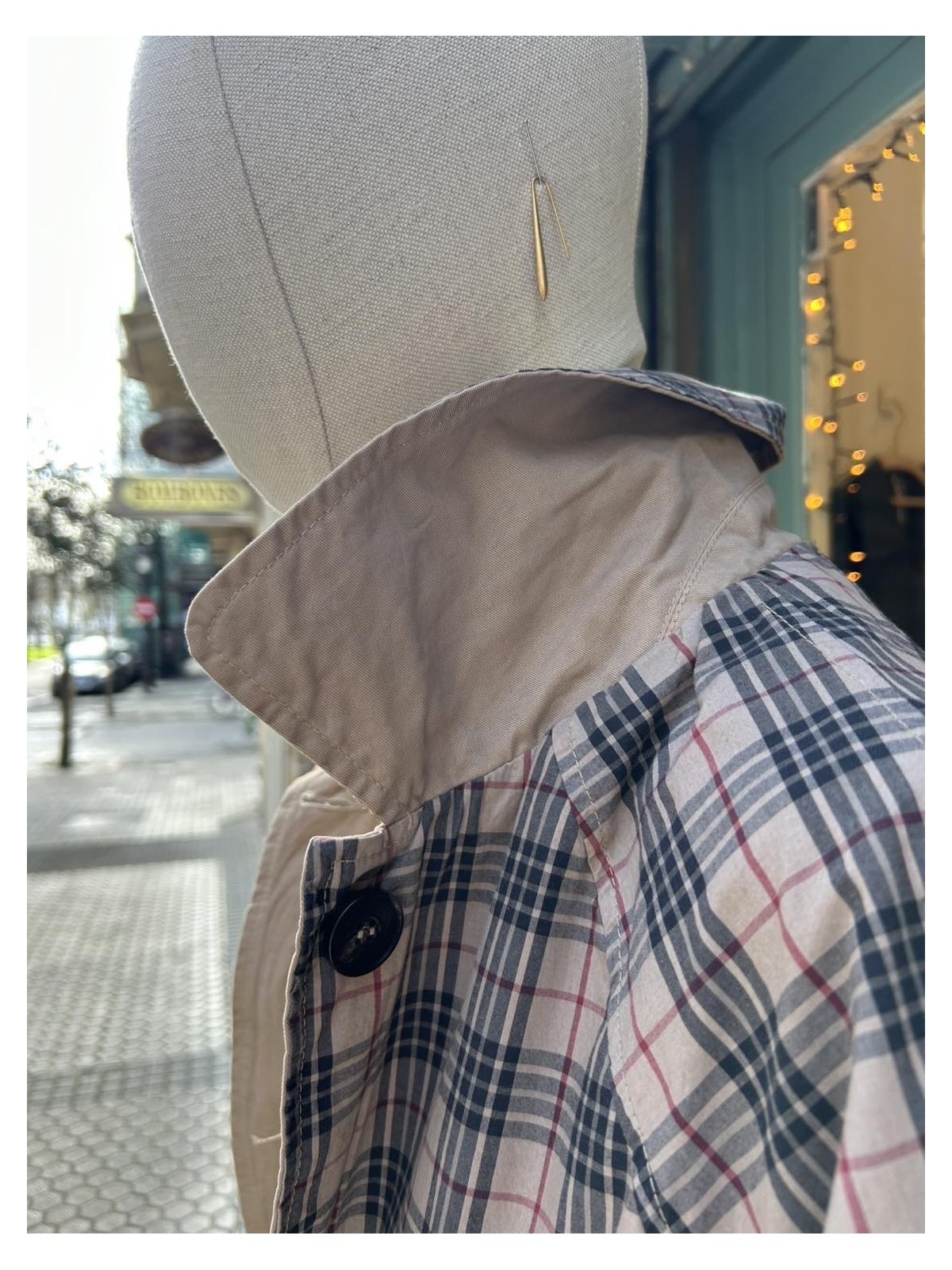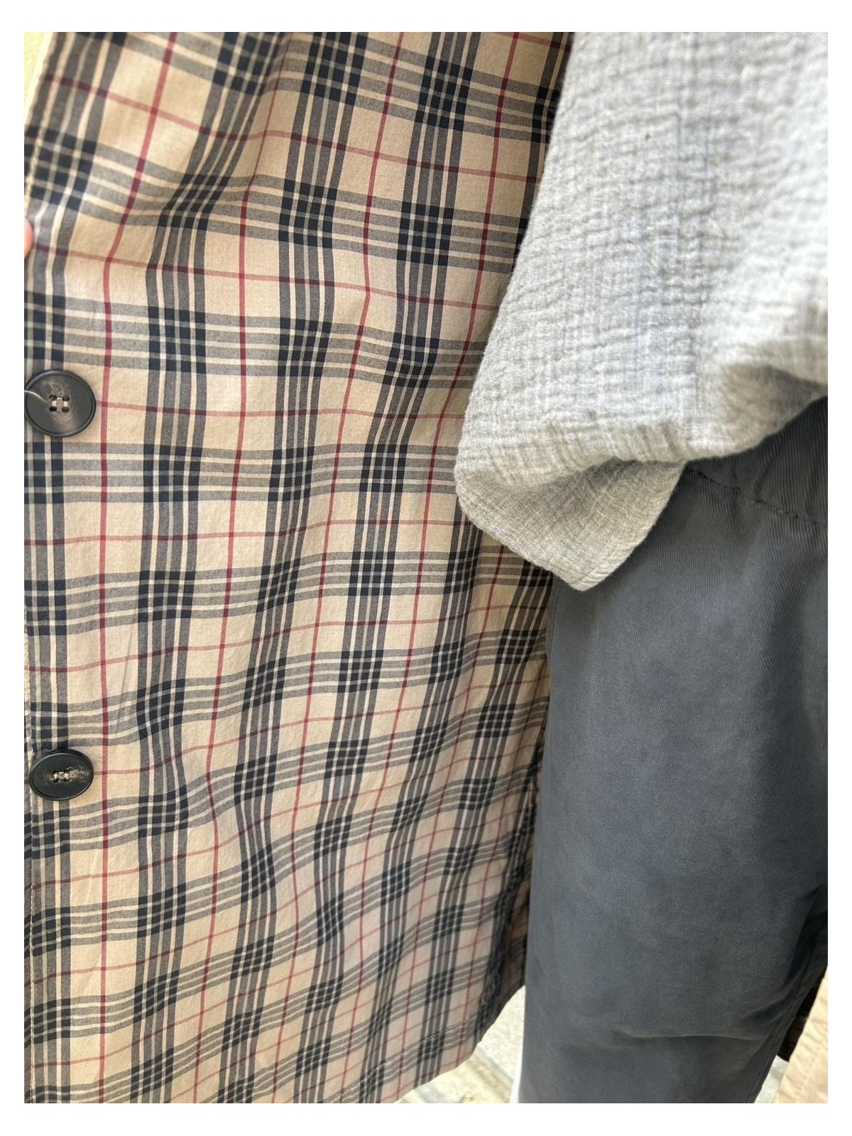 Gabardina reversible con bolsillos en ambos estampados y botones únicamente en el tejido a cuadros. No es una prenda especialmente grande teniendo en cuenta que es talla única
