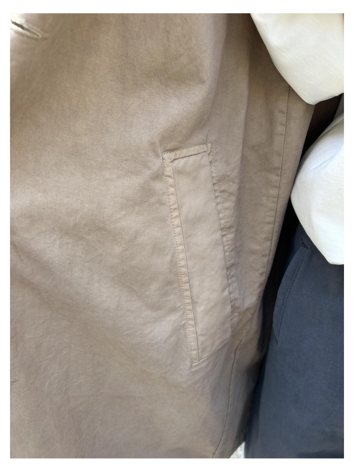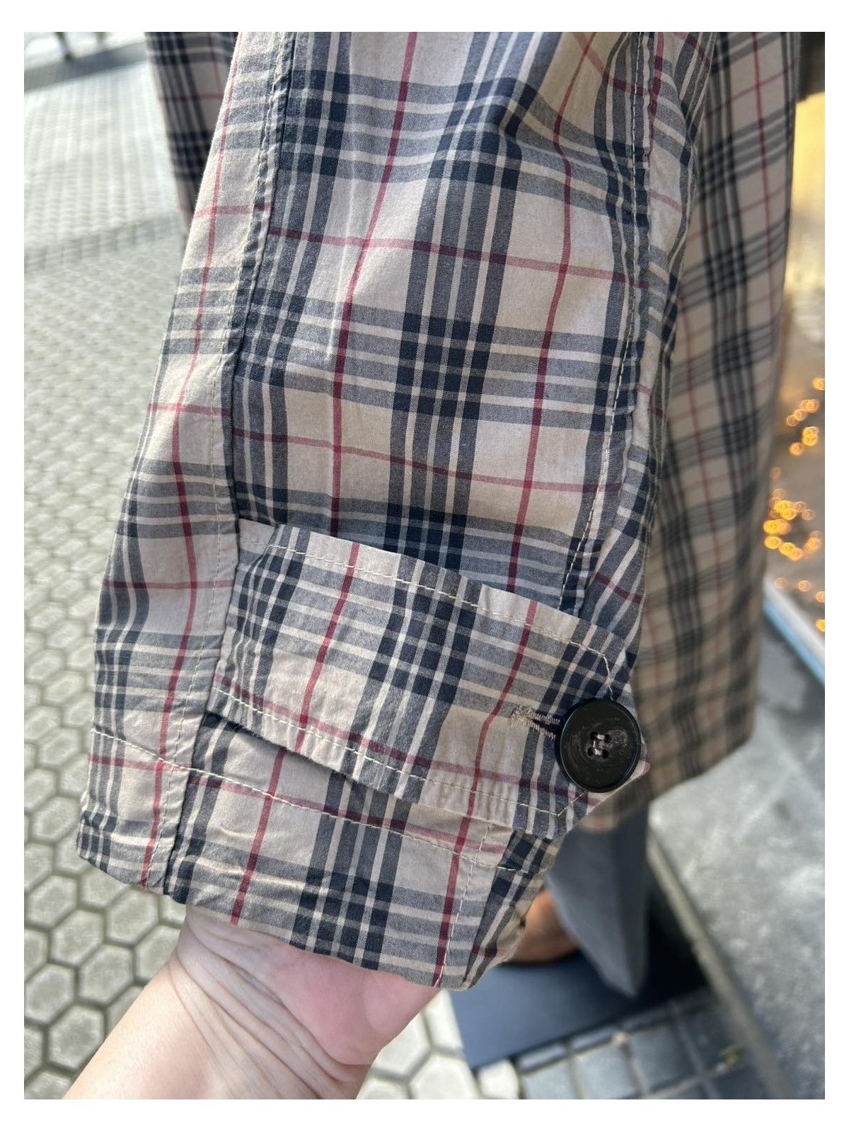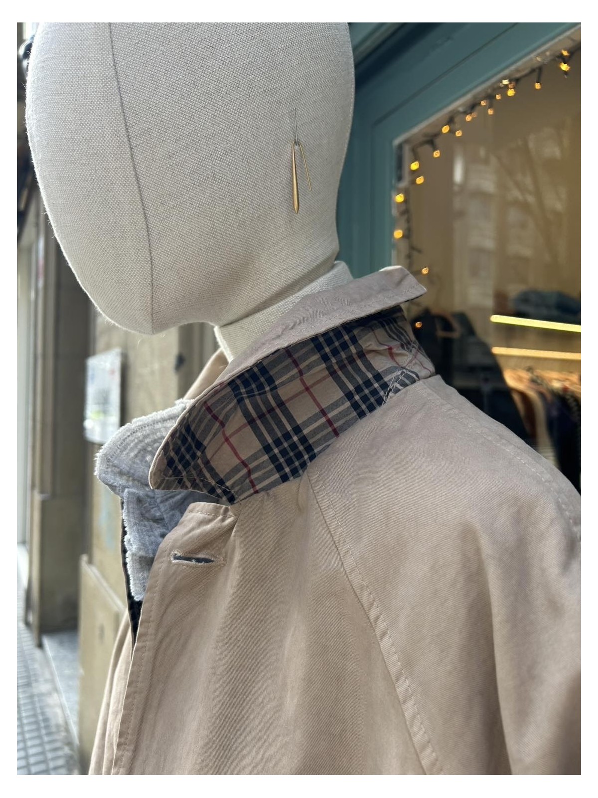 Gabardina reversible con bolsillos en ambos estampados y botones únicamente en el tejido a cuadros. No es una prenda especialmente grande teniendo en cuenta que es talla única